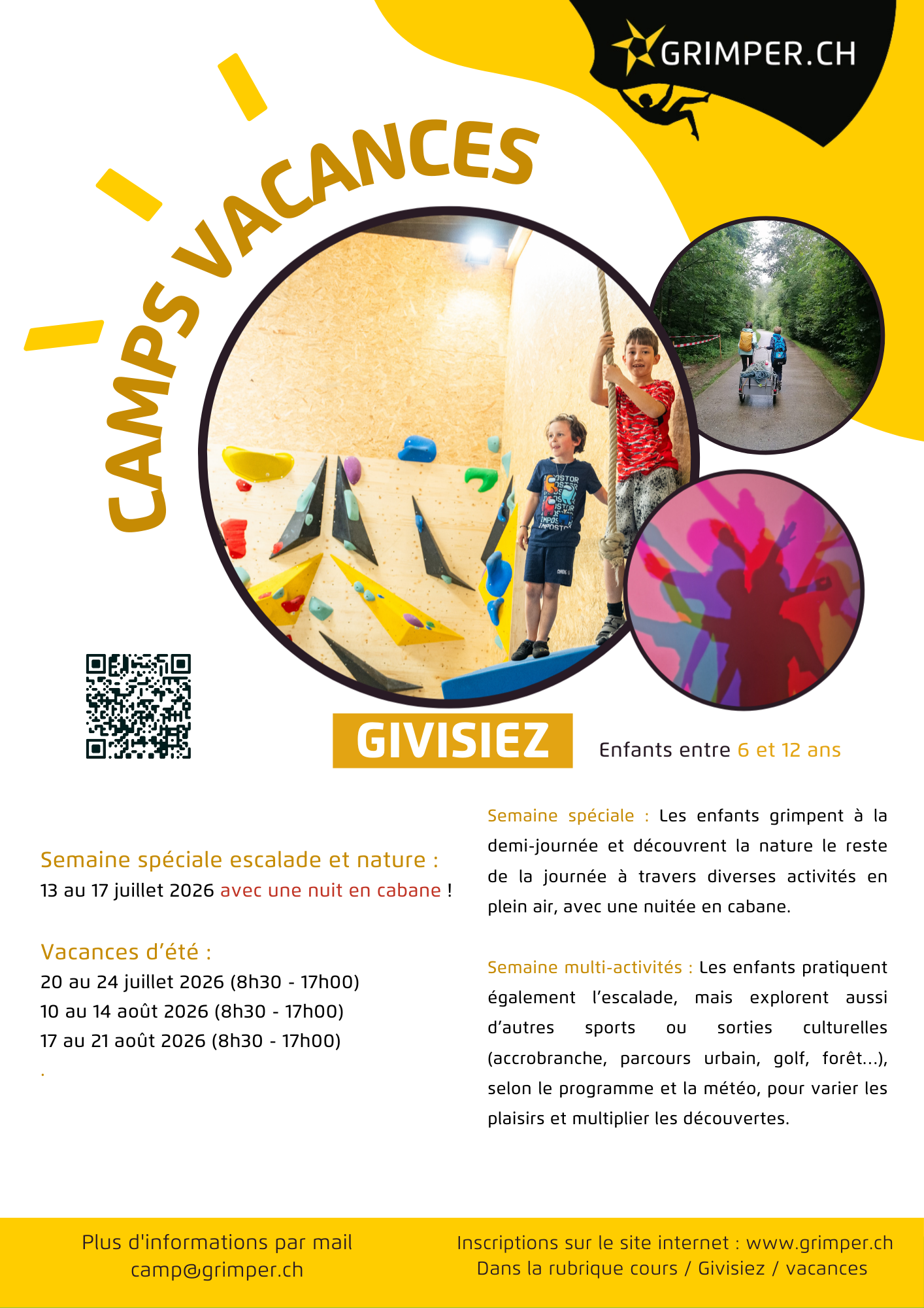 ESCALADE ET ACTIVITÉS DANS LA NATURE POUR ENFANTS DE 6-12 ANS Semaine spéciale escalade et nature : 13 au 17 juillet 2026 (avec 1 nuit en cabane) Pour obtenir des informations : camp@grimper.ch |